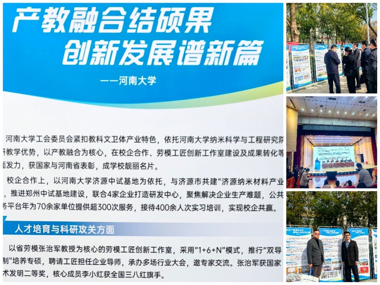 我校以产教融合为核心,在校企合作、劳模工匠创新工作室建设及成果转化等方面持续发力,取得了丰硕成果。通过共建济源纳米材料产业园、推进中试基地建设、联合企业打造研发中心,学校为企业提供大量技术服务与人才培训,实现校企共赢;以省劳模张治军教授为核心的劳模工匠创新工作室,采用“1+6+N”模式和“双导师制”培育专业人才,斩获多项国家级荣誉;多项核心技术成功转化落地,形成规模化产能与显著经济效益,成为学校发展的靓丽名片。此次会议展出的展板,系统呈现了我校在产教融合工作中的实践路径与突出成就,为兄弟单位提供了宝贵的借鉴经验。