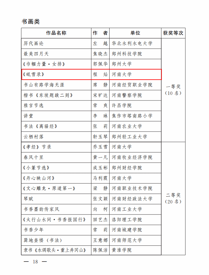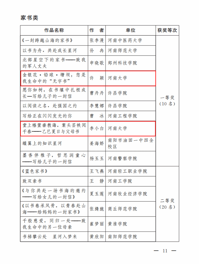第一附属医院栗娟作品《一盏灯,一片肺叶,一条强国路——<平凡的世界>阅读札记与岗位践行》获征文类一等奖;图书馆许颖作品《金银花·铅球·塘坝:您是我生命中的“无字书”》、黄河文明与可持续发展研究中心李小白作品《堂上椿萱垂教诲,案头芸帙阅千春——乙巳夏日与父母书》获家书类一等奖;美术学院程灿作品《砥雪录》获书画类一等奖。