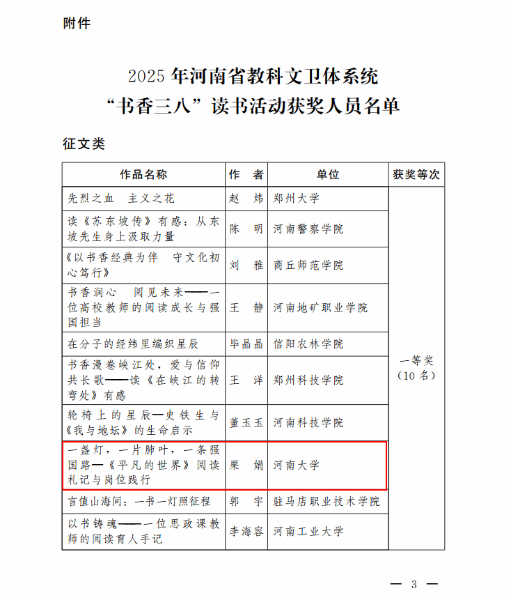 近日,河南省教科文卫体工会公布2025年“书香三八”读书活动获奖名单,我校选送的15件参赛作品全部获奖,其中一等奖4项,二等奖5项,三等奖4项,优秀奖2项。