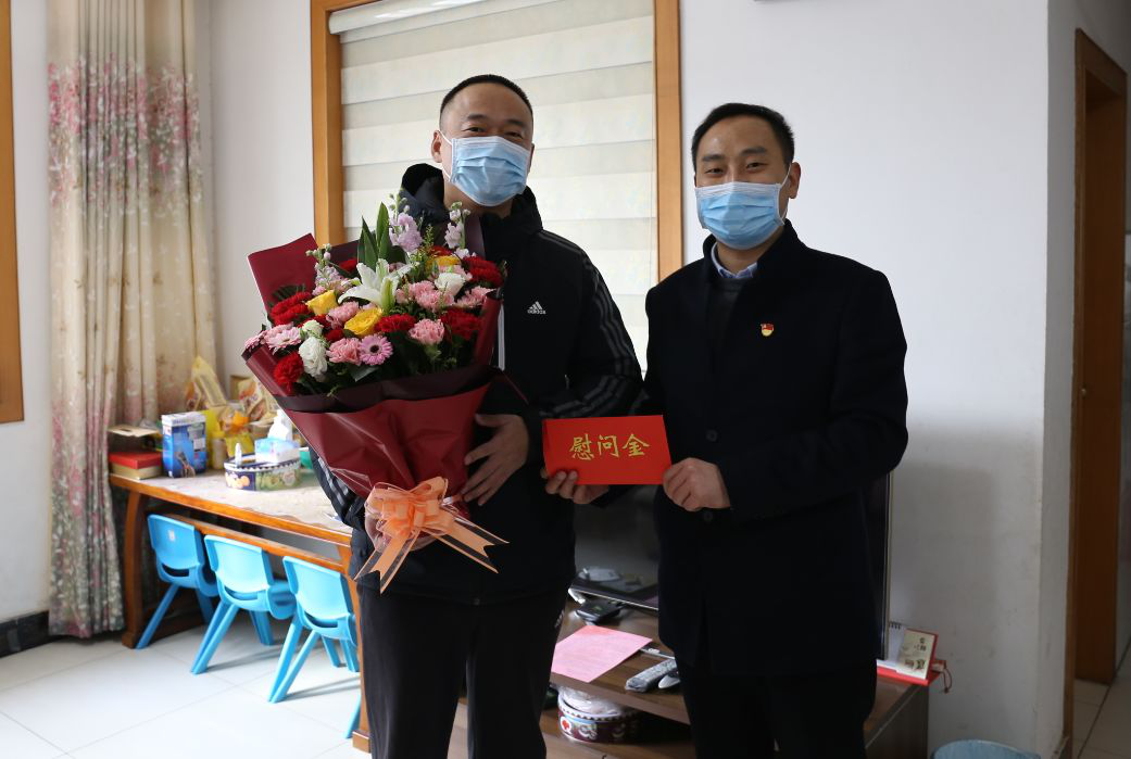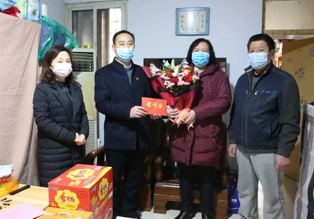“三八节”前夕,为了关心、关爱援鄂女医务工作者家庭,3月3日上午,工会主席霍雷,副主席、女工委主任徐霞、内科党总支书记魏伦收、团委副书记刘军颖等同志受院党委、行政委托,陪同市总工会女工委主任程海梅共同看望慰问援鄂医疗队女队员郑晶晶、王雪艳家属,送上慰问信、医用防护物资、瓜果蔬菜等慰问品及慰问金。