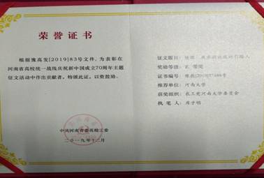 一附院工会主席席子明在河南省高工委举行的“庆祝新中国成立70周年”主题征文比赛中荣获二等奖,在学校统战部举行的“庆祝新中国成立70周年”主题征文比赛中荣获一等奖和三等奖。