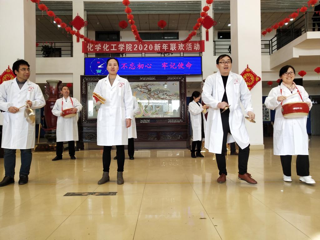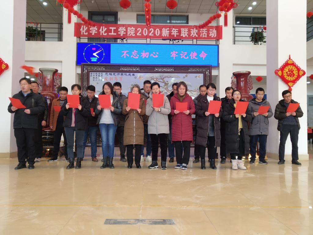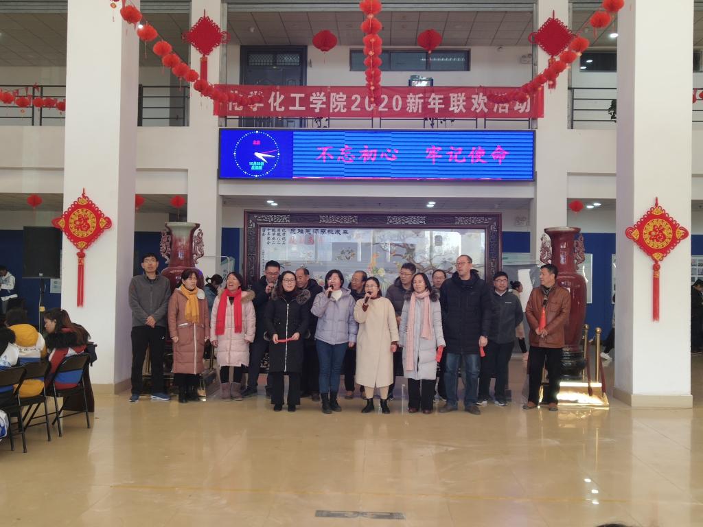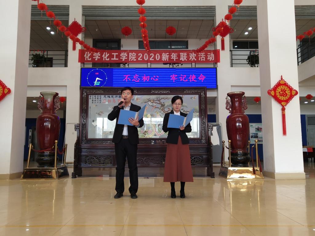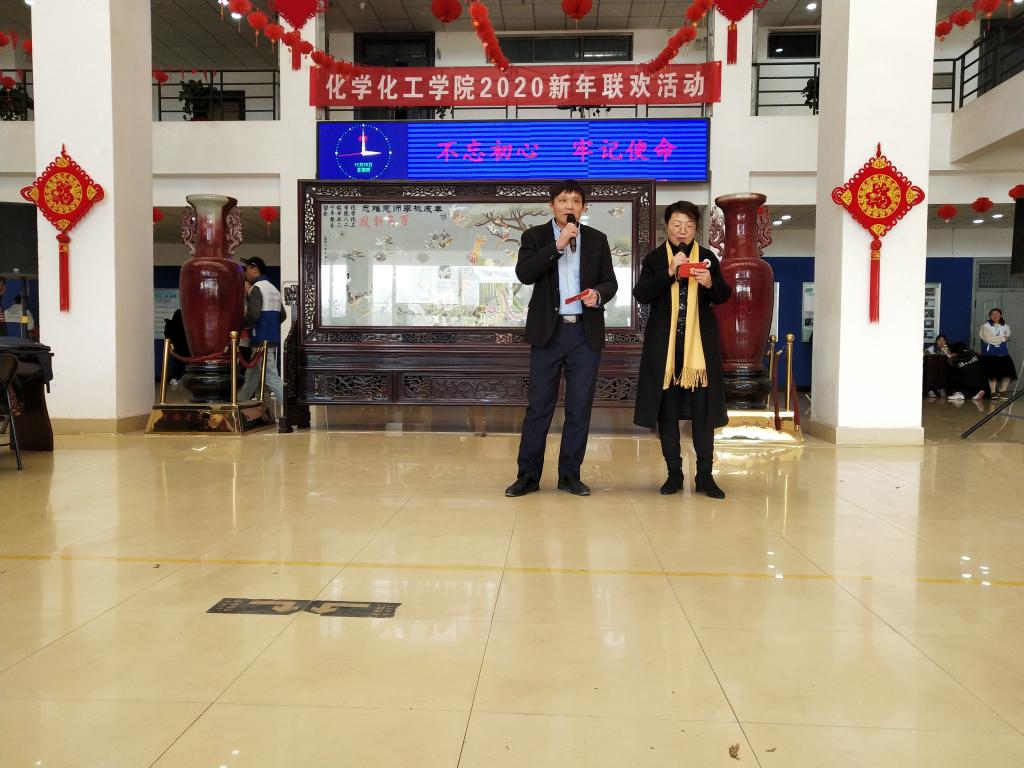 2019年12月26日下午,化学化工学院一楼大厅热闹非凡,“不忘初心、牢记使命”2020新年联欢活动正在音乐声和欢笑声中拉开帷幕。此次活动由学院工会组织,经过院团委学生会近一个月的精心策划和筹备,得到了学院领导、老师和同学们的高度重视和积极参与。此次联欢会以“不忘化学初心、牢记育人使命”为主题,在欢庆祥和的气氛中迎接新年,展现化学人建设“双一流”的新风貌。出席本次活动的有校工会副主席刘迎红、化学化工学院和纳米材料工程研究中心的全体老师以及学院的部分学生代表。联欢活动由学院副院长徐元清和蔡永红老师共同主持。