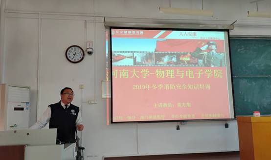 为加强冬春季节火灾防控工作,预防和遏制火灾事故发生,12月19日,物理与电子学院“2019年冬季消防安全知识培训”在金明综合楼2201教室召开。本次知识培训由河南省消防协会消防宣传与服务中心教员主任董方旭主讲,学院全体教师和部分学生代表参与了本次培训。