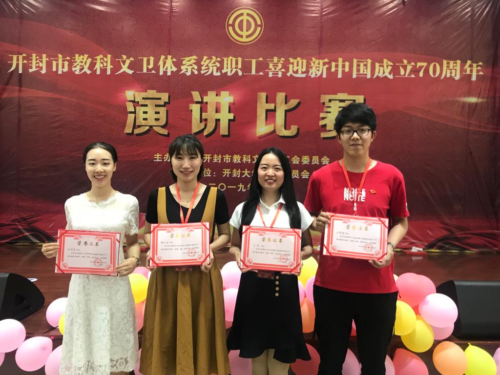 5月25日至26日,一附院工会选拔推荐的王影、杨玉茹、王锦慧、许园晨4名选手,参加了“开封市教科文卫体系统职工喜迎新中国成立70周年演讲比赛”。经过两天的激烈角逐,4名选手在来自全市64家单位的107名选手中脱颖而出,全部荣获一等奖。