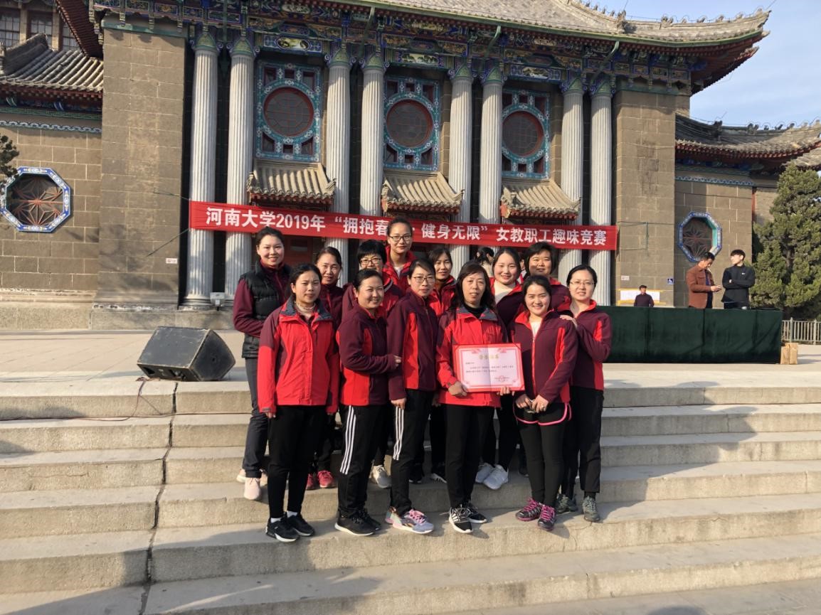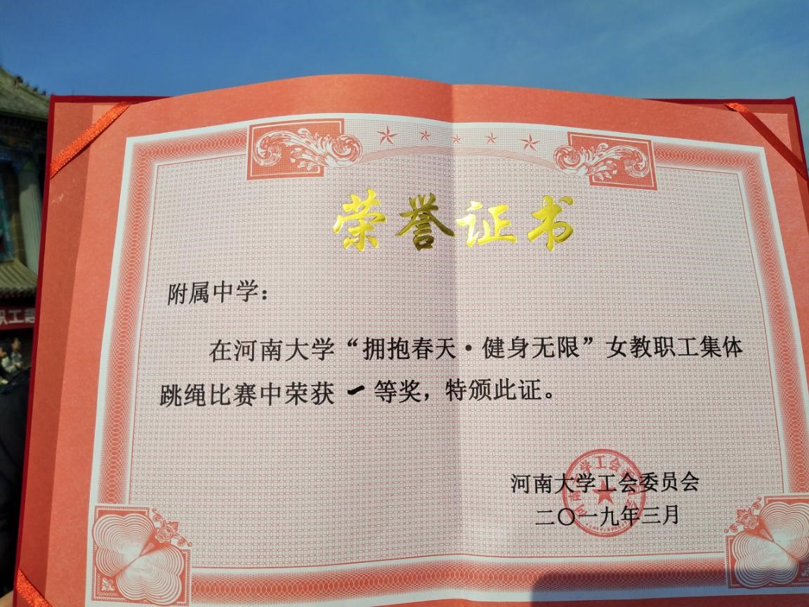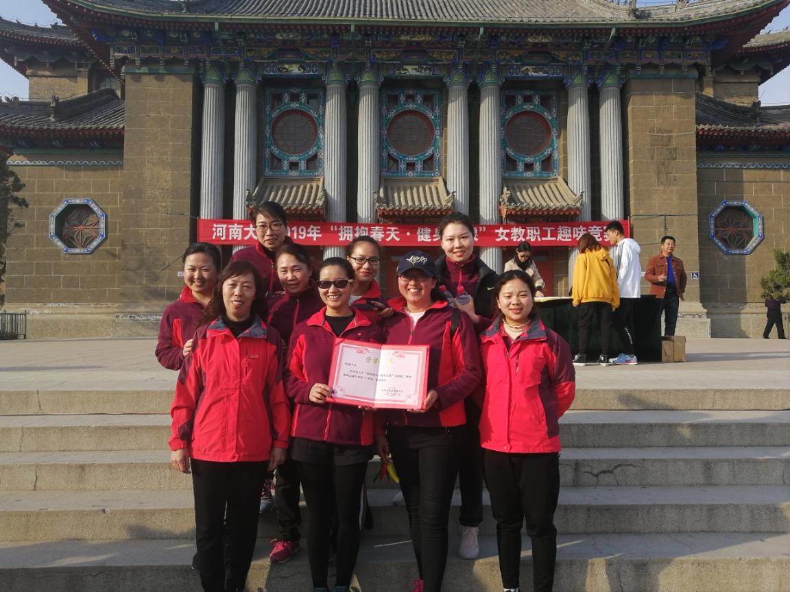 春风送暖,杨柳吐翠。在这春意盎然的季节,我们又迎来了一年一度的“三八”国际妇女节。2019年3月7日下午,由河南大学校工会组织举办的“拥抱春天,健身无限”女教职工趣味竞赛,在河南大学明伦校区如期举行,我校纪委书记程金辉、工会主席尹来恩、女工委员刘大玫带领我校教职工参赛。附中代表队表现出色,从参赛的近50支代表队中脱颖而出,以第二名的优异成绩再次夺得一等奖。