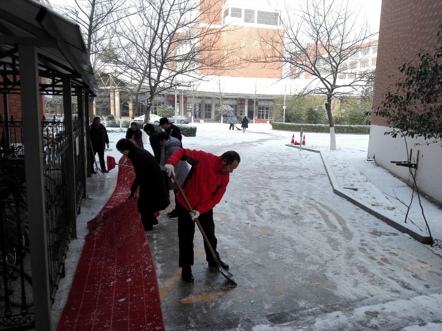 2019年1月8日,开封市迎来了新年的第一场雪。大雪给交通带来了极大的不便,光滑的路面使师生通行存在安全隐患。1月10日上午,迎着雪后初升的太阳,教育科学学院行政工会小组一行近20人在宋伟老师的带领下开展扫雪工作。老师们分工明确、配合默契,整个扫雪过程有条不紊。看着同学们走在自己打扫出来的道路上,老师们脸上露出了开心的笑容。