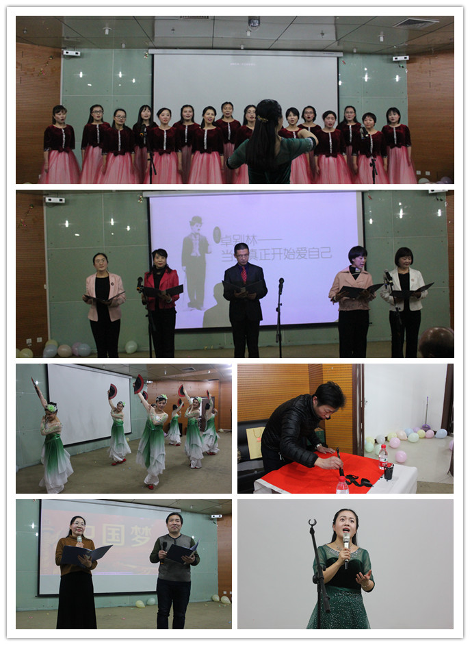 信息部史英老师为我们带来独唱《金风吹来的时候》,歌声婉转,饱含深情;徐磊老师的古风舞蹈《梅花引》舞姿优美,令人沉醉。陈艳艳老师的独唱《往日时光》,嗓音醇厚优美,意境深邃,旋律动人,引来全场热烈掌声。诗朗诵《沁园春雪》、《当我真正爱自己》、《读中国》带我们感受诗词的魅力。信息部的合唱《青春舞曲》让我们感受到青春的活力、技术部的合唱《我的祖国》带我们一起感受祖国的壮美和先辈战争奋斗的不易。别具特色的书法+舞蹈《国色天香》节目带来别样风情,由秦春阳、董保玲、杨红梅、张雅红、徐磊、张敏、郭文荣七位老师翩跹起舞,尼志强老师现场书写福字为大家送上祝福。