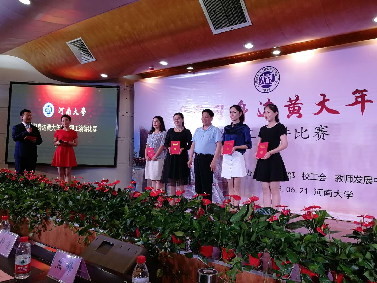 为贯彻落实习近平总书记就黄大年同志先进事迹重要批示,进一步加强教师职业道德建设,充分展示广大教师爱岗敬业、无私奉献的精神风貌,引导广大教职工积极为学校“双一流”建设建功立业,6月21日下午,由河南大学党委宣传部、校工会、教师发展中心联合主办的河南大学“学习身边黄大年”教职工演讲比赛决赛在金明校区举行。由一附院工会选送的选手贾梦荣获二等奖。