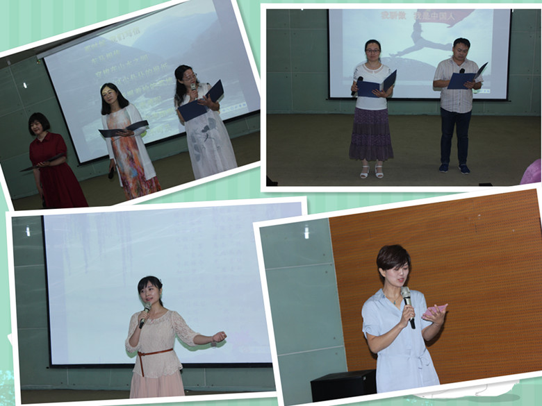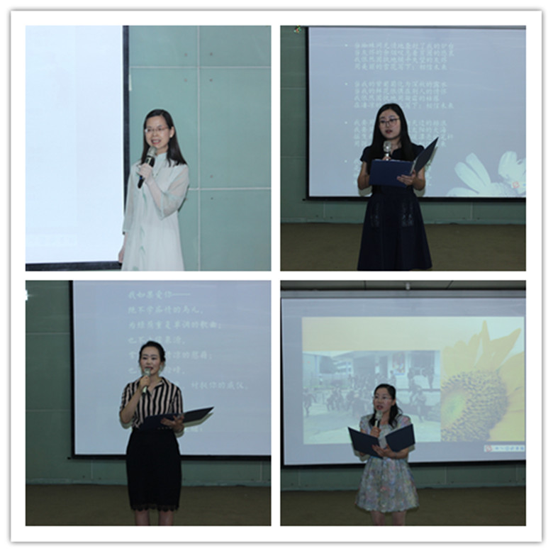 朗诵会由秦春阳老师主持,本次朗诵会共有8个部室推选的8个节目,本次朗诵会要求每一个节目都必须配乐和PPT背景展示。音乐响起,选手们深情演绎了戴望舒的《雨巷》、李庆文的《我们@中国》、《送给天堂的孩子》、《你是我生命中最美丽的相遇》、《相信未来》、舒婷的《致橡树》、姜夔的《扬州慢·淮左名都》、王怀让的《我骄傲,我是中国人》等作品。朗诵选题多样,包含现代诗歌、当代诗歌、散文以及古诗词。其中,期刊部马志赟、韦爱芬、张红艳三位老师朗诵的《我们@中国》是2017年由中央网信办、中央电视台联合主办的《点赞中国——“五个一百”网络正能量精品展播特别节目》其中之一。诗中嵌入了“@、圈粉、二维码等网络热词”,题材新颖,又充满正能量。采编中心张丽丽、许瑞红、王丽萍、周璇、许乐老师的《你是我生命中最美丽的相遇》是一首浪漫的爱情诗,五位老师将朗诵配合舞蹈,意境优美,回味无穷。宋璞老师朗诵的南宋词人姜夔的代表作《扬州慢·淮左名都》,声音和婉,气度娴雅,优美的语言配合生动的表情,把作品的意境演绎的淋漓尽致,扣人心弦。