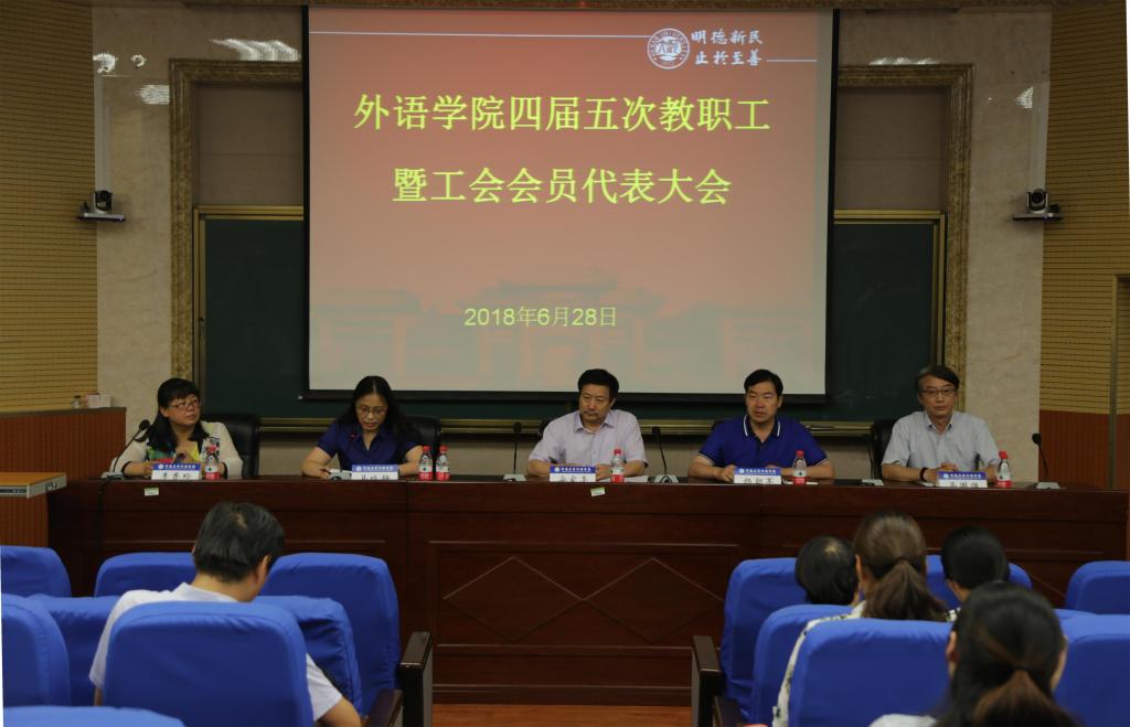 2018年6月28日下午,外语学院四届五次教职工暨工会会员大会在学院北楼三厅举行。学院全体教工参加了此次会议。会议由外语学院党委副书记马晓静主持。