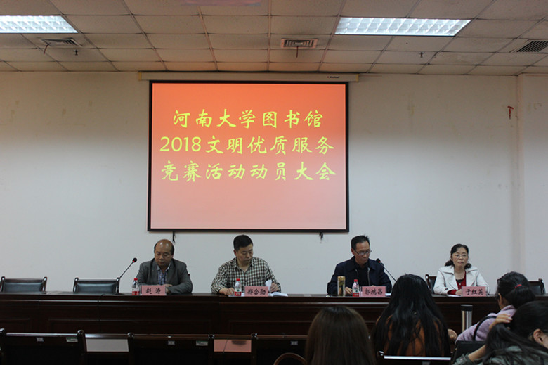 2018年4月26日下午,在金明校区图书馆一楼会议室,图书馆召开了2018年文明优质服务竞赛活动动员大会。会议由图书馆党总支书记郭鸿昌主持。全体馆领导班子和全体工会会员与会。