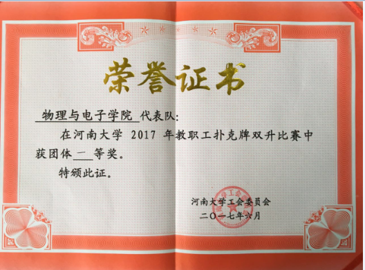6月22日、24日,校工会在明伦校区教职工活动中心举办了河南大学2017年教职工扑克牌双升比赛。共有初赛胜出的12支代表队参赛。物理与电子学院代表队荣获团体一等奖。