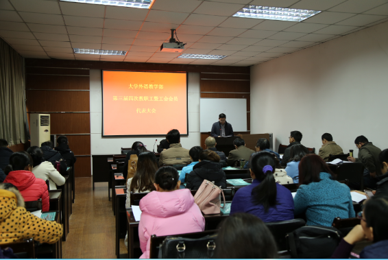 11月17日下午,大学外语教学部第三届四次教职工暨工会会员代表大会在部会议室召开。此次会议为专题教职工代表大会,主要就《大学外语教学部关于教师赴国外访学的管理办法》进行讨论和修订。外语部全体党政领导和教职工代表参加会议。开幕式议程由部党总支书记王恒兵主持。