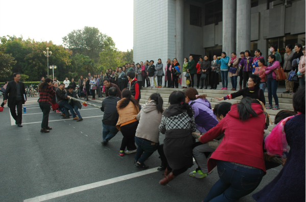 2015年10月29日下午,河南大学图书馆职工拔河比赛在明伦校区逸夫图书馆门前广场举行。老师们早早来到赛场,为参加比赛做着准备。赛前,工会主席王彦明讲话为同志们加油鼓劲,希望大家注意安全,赛出风格,赛出水平。工会副主席刘陆军宣读了比赛规则