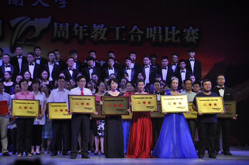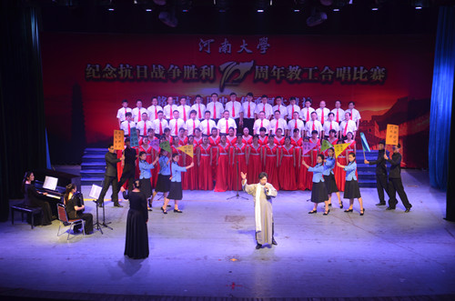 6月18日下午3点,以“铭记抗战历史·传承河大精神”为主题的河南大学纪念抗日战争胜利七十周年教工合唱比赛决赛在明伦校区大礼堂举行。比赛由河南大学党委宣传部、河南大学工会主办,艺术学院承办。娄源功、赵国祥、刘先省、许绍康、雷霆、朱恒宽、何喆等校领导以及各基层单位的领导老师出席并观看了比赛。