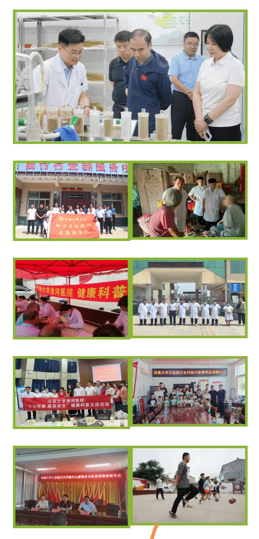 三、积极践行医疗、健康下乡活动,深入开展乡村振兴医疗帮扶、体育下乡。我校学术副校长、医学院院长崔大祥调研组先后走访了中原药谷科创园、叶岭丹参种植基地、顺势药业、中原药谷康养医院项目及中原药谷核心区建设等项目,详细了解河南县乡中医药人才结构、科技研发、成果转化及产业链规划布局;医学院和校工会一起积极开展医疗下乡、就业帮扶活动,淮河医院、一附院几个月来下沉社区、深入乡村,受到群众广泛好评;淮河医院联合校工会举办“药草生香润万家”健康科普义诊系列活动,活动已开展10余次,淮河医院党委书记张东强、工会主席霍雷、校工会办公室主任刘银华等积极组织、服务,院长左克强多次以专家身份义诊;河南大学健康管理研究创新工作室领衔人徐明珑积极探索与乡镇卫生院长期合作机制,在乡村卫生院创新建立工作室乡村工作站,培养乡村医生,直接把医疗送到村里,不仅下乡“送医”,而且“留技”乡村,持续提升乡村医疗自主服务能力。河南大学苗苗劳模工作室深入乡镇中小学,开展多场次游泳和溺水救助技能培训,组织乡村中小学师生开展篮球等体育活动,为乡镇师生暑期防溺水、保安全、健康体魄助力,积极推动乡村体育活动的健康开展。