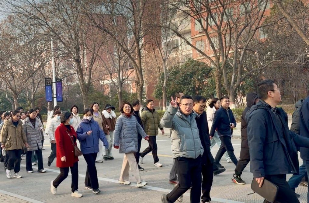 活动伊始,老师们在学院门前集合,学院党委副书记、工会主席马文海主持启动仪式,之后,全体教师合影留念。午后的阳光洒满校园,为健步走活动增添了温暖与活力。随着学院党委书记常凤香一声“出发”指令的发出,队伍排成五列纵队整齐出发,沿途充满欢声笑语,气氛轻松热烈。行进途中,老师们步伐矫健、交流融洽,既在运动中舒展身心,也在互动中增进情谊。参与活动的教师纷纷表示,此类活动有效缓解了教学、科研压力,促进了跨学科学术交流,有助于激发科研创新活力,增进团队协作。