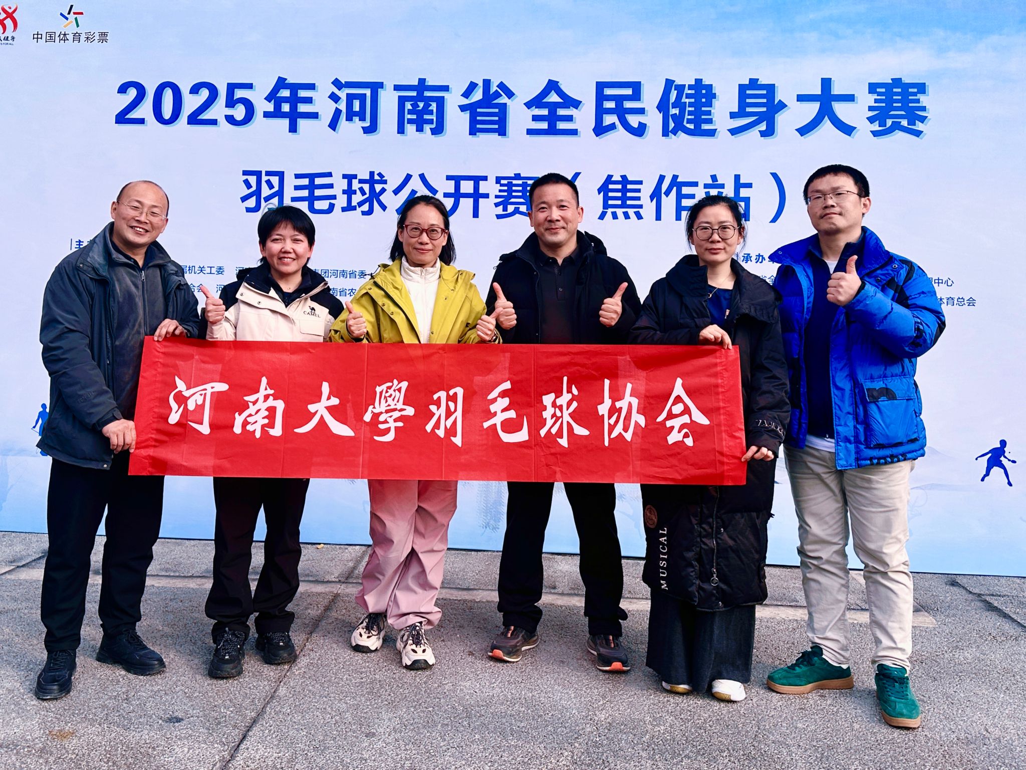 为积极响应全省全民健身工作部署,2025年11月22日至23日,河南大学羽毛球协会八名成员赴焦作参加了“2025年河南省全民健身大赛羽毛球公开赛(焦作站)”,在比赛中团结拼搏,荣获佳绩,其中会长刘谨和副会长张凯乐组成的混双组合获得赛事D组河南省第五名,刘华侨和刘建莉老师组成的混双组合获得赛事C组前十二名。