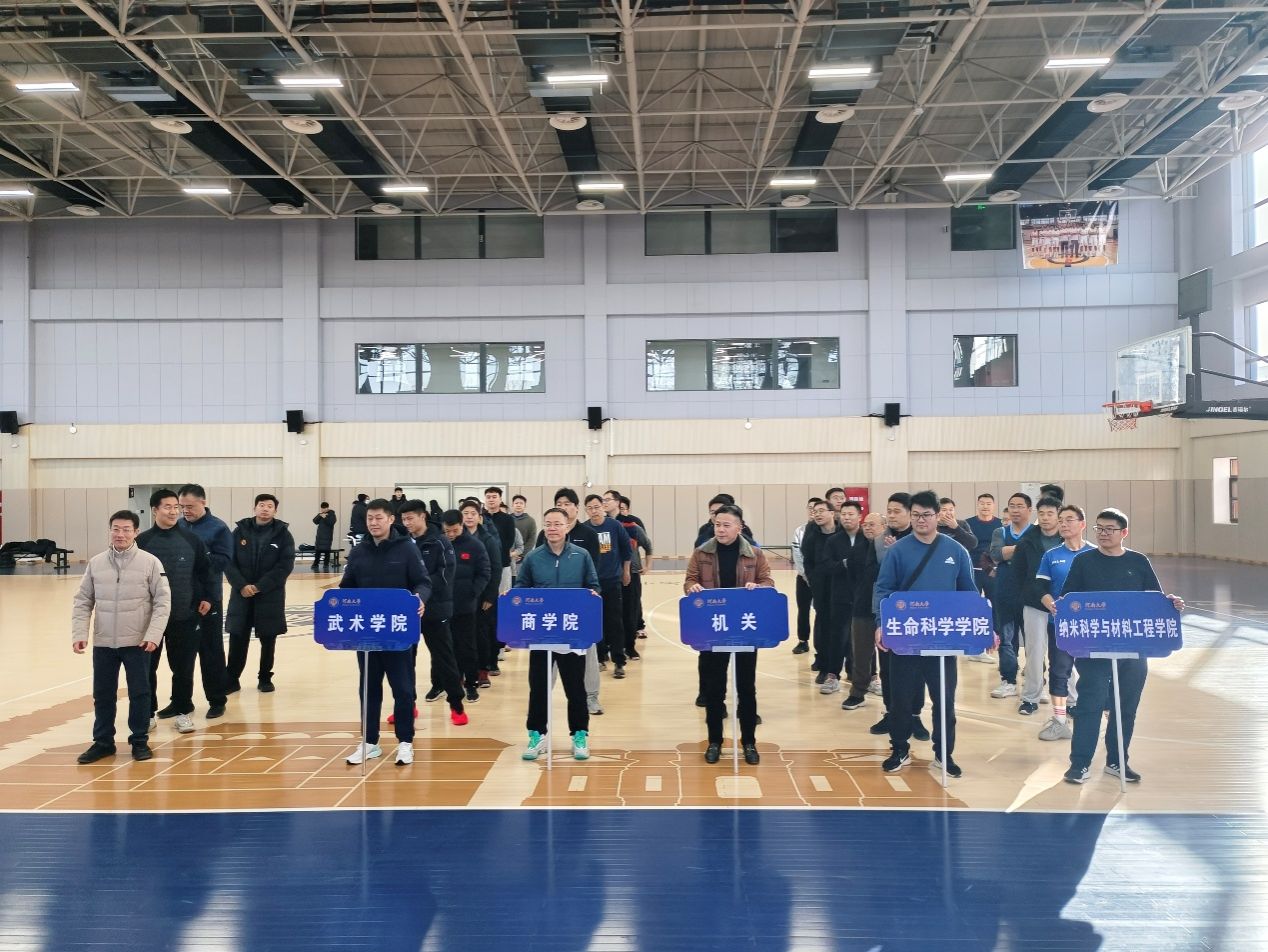 仪式最后,全体领导、嘉宾与参赛队伍合影留念,定格下这一团结奋进的美好时刻。合影结束后,随着一声哨响,河南大学“迎新年,筑友谊”教职工篮球邀请赛正式开赛,揭幕战对阵双方是:武术学院VS纳米科学与材料工程学院。